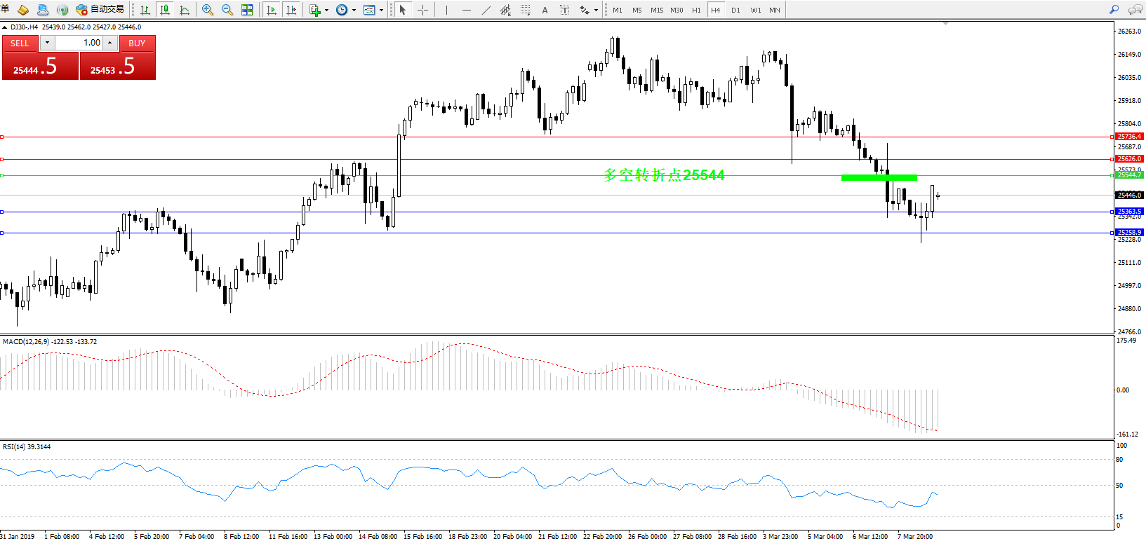 道琼斯指数DJ30—— 4小时K线图显示: