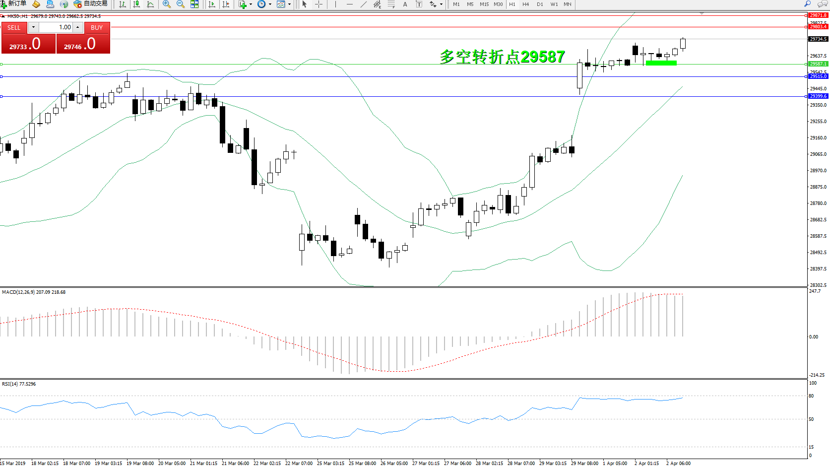 中国内地股市高开后全天维持宽幅震荡格局,截至收盘,香港恒生指数早盘高开后震荡走低,随后维持在略高于平盘线的水平盘整,截至收盘,恒指涨0.21%,报29624.67点。中美两国之经济数据齐优于预期,加上内地由41日开始,暂停征收美国进口汽车及零部件之关税,利好正在进行中的谈判。市场前期对经济的担忧得到改善。就目前状况而言,市场做多情绪依然浓厚。