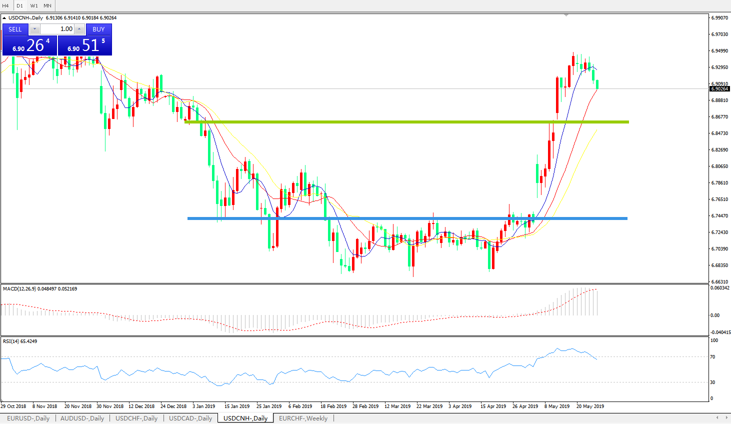 技术面简析:日线图短期均线开始拐头下行,MACD在0轴上方运行但动能柱有缩量迹象,RSI超买区域下行,汇价强力上攻后乏力下行,预计短期汇价有下行回踩需求,中期重点关注中美贸易争端后续进展。