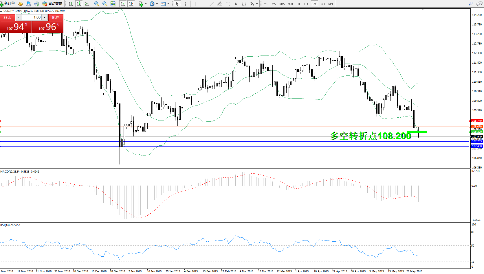 交易策略:108.200下方看跌,目标107.705、107.450