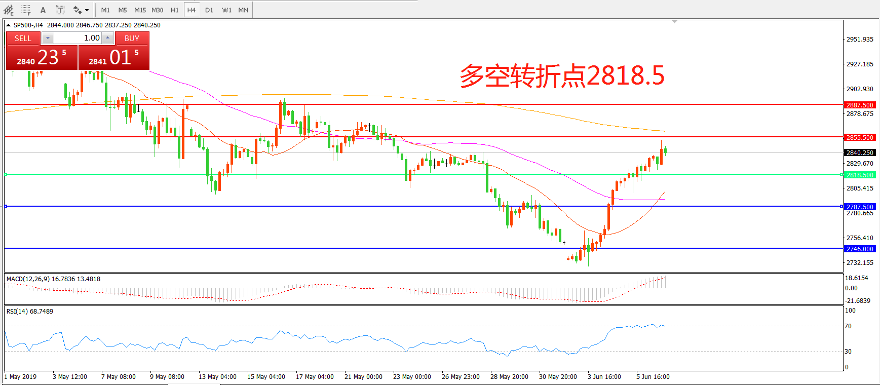 4小时图看,标普低位连续反弹,突破多空分水岭2787.5后直指上方阻力,短期均线有拐头迹象,MACD红柱增加,RSI指标走平,日内有延续反弹可能。