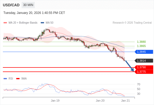 在 1.3845 之下,看跌,目标价位为 1.3790 ,然后为 1.3775 。