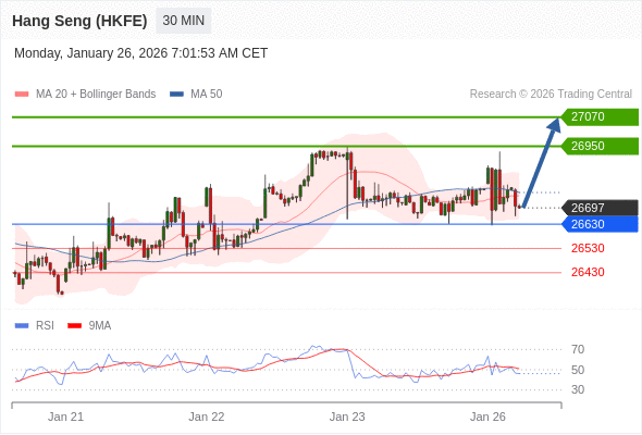 在 26630 之上,看涨,目标价位为 26950 ,然后为 27070 。