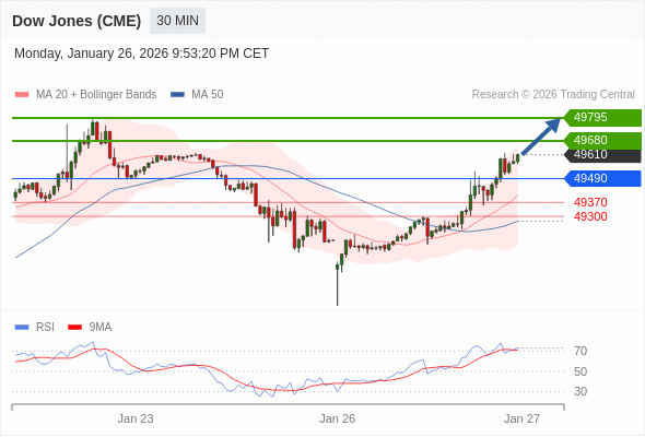 在 49490 之上,看涨,目标价位为 49680 ,然后为 49795 。