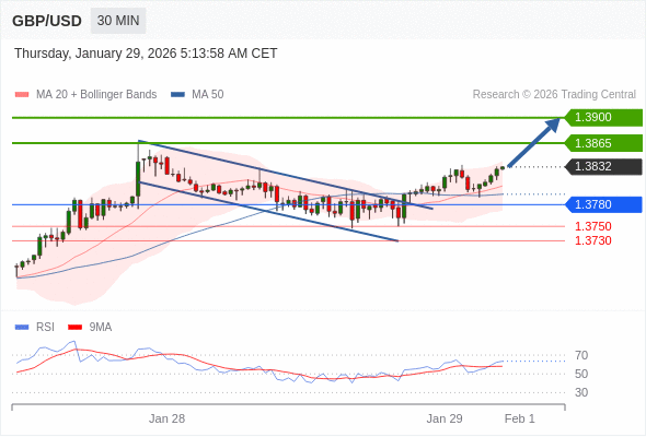 在 1.3780 之上,看涨,目标价位为 1.3865 ,然后为 1.3900 。