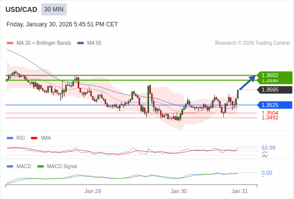 美元/加元 当日内 : 看涨,当 1.3525 为支撑位。
