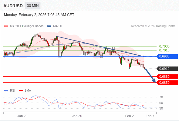 在 0.6980 之下,看跌,目标价位为 0.6880 ,然后为 0.6850 。