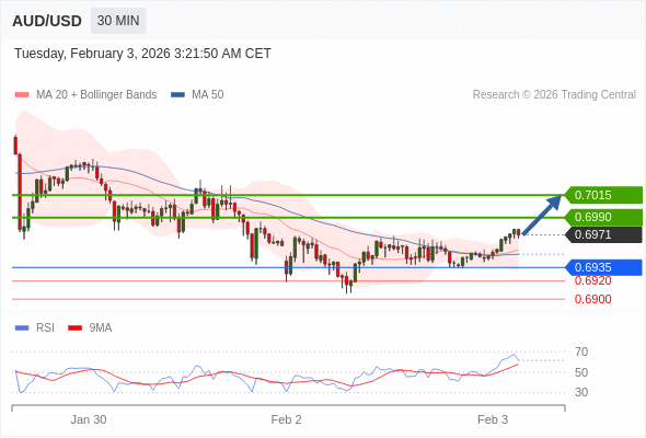 在 0.6935 之上,看涨,目标价位为 0.6990 ,然后为 0.7015 。