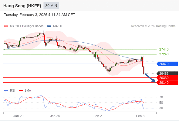 在 26870 之下,看跌,目标价位为 26330 ,然后为 26140 。