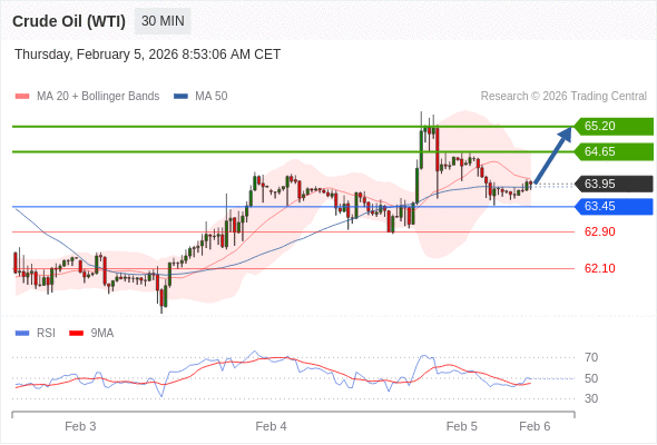 在 63.45 之上,看涨,目标价位为 64.65 ,然后为 65.20 。