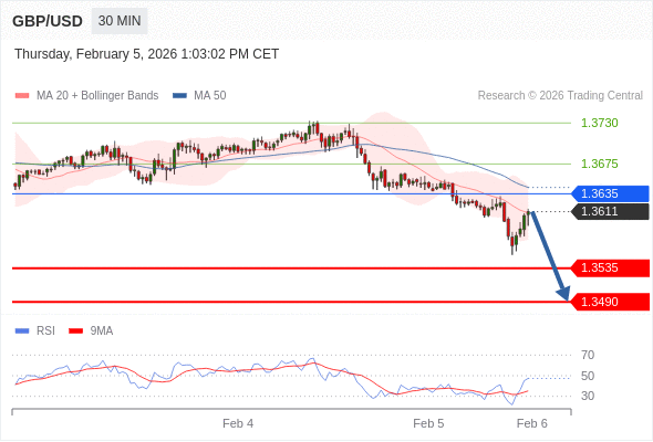 交易策略: 在 1.3635 之下,看跌,目标价位为 1.3535 ,然后为 1.3490 。