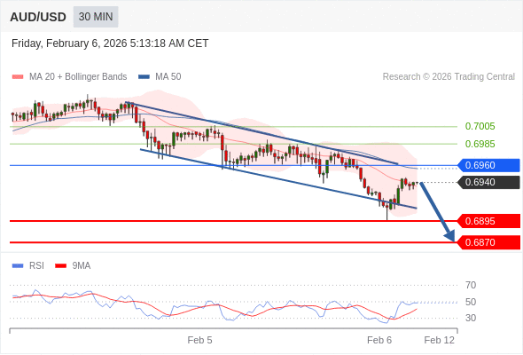 交易策略: 在 0.6960 之下,看跌,目标价位为 0.6895 ,然后为 0.6870 。