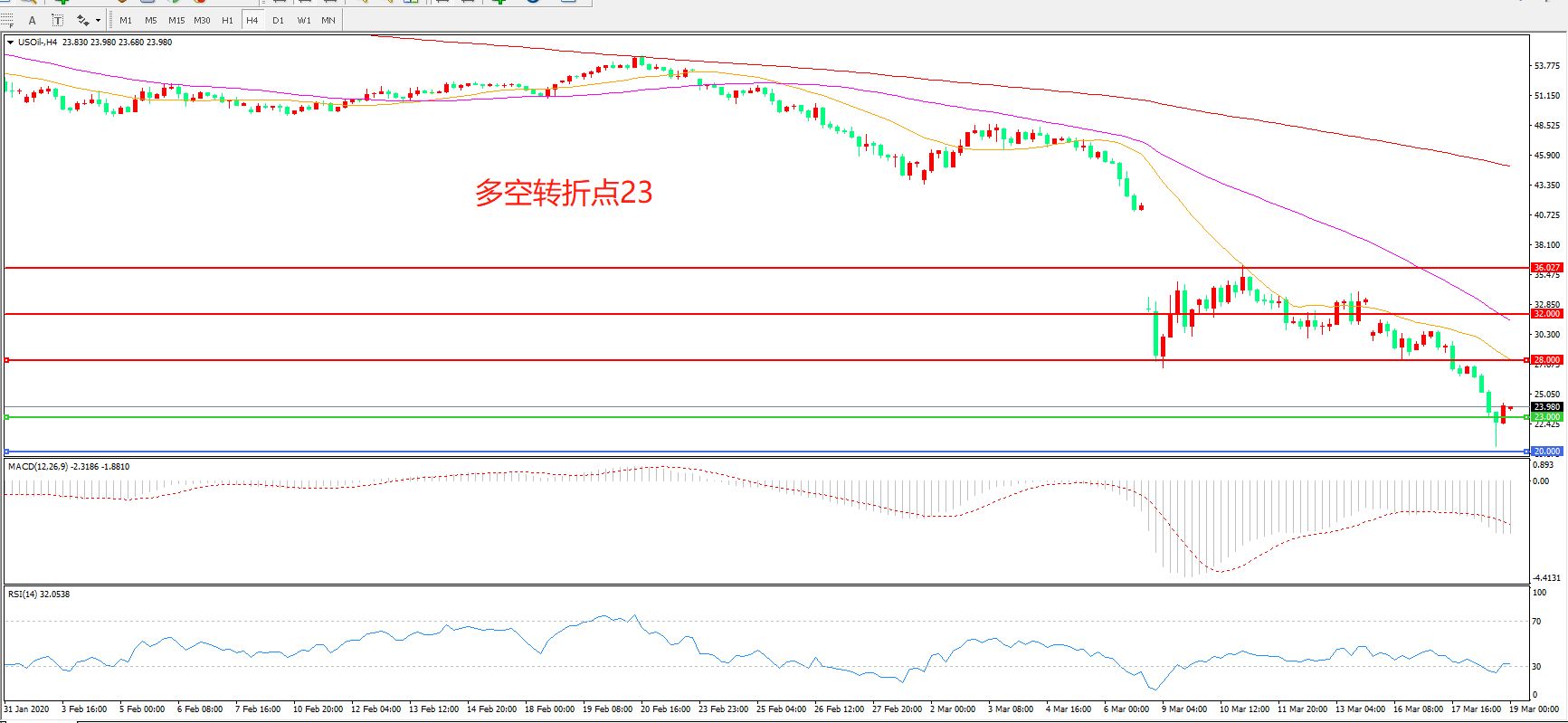 交易策略:在23.00之下看跌,目标20.00         18.00