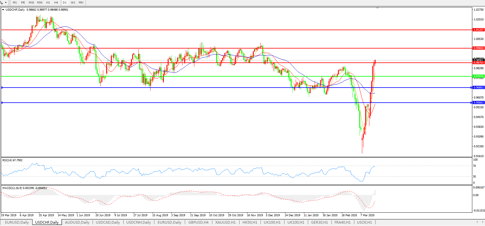 技术面简析:日线图均线整体呈多头排列,汇价继续小幅攀升,MACD于0轴下方拐头上行且量能0轴上方放量,RSI快速走升,预计汇价料将进一步上行。