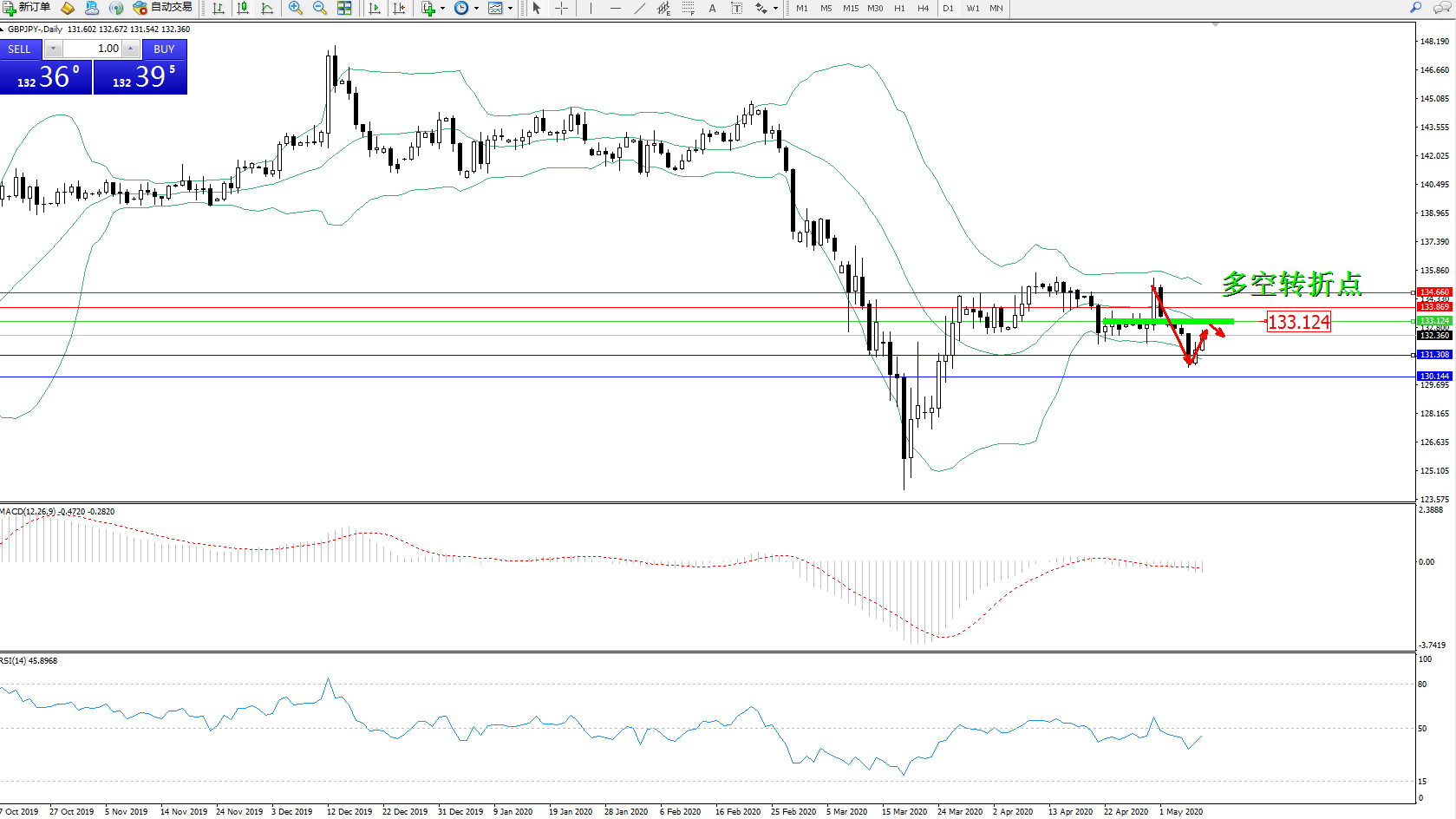 交易策略:133.124下方看跌,目标131.308、130.144