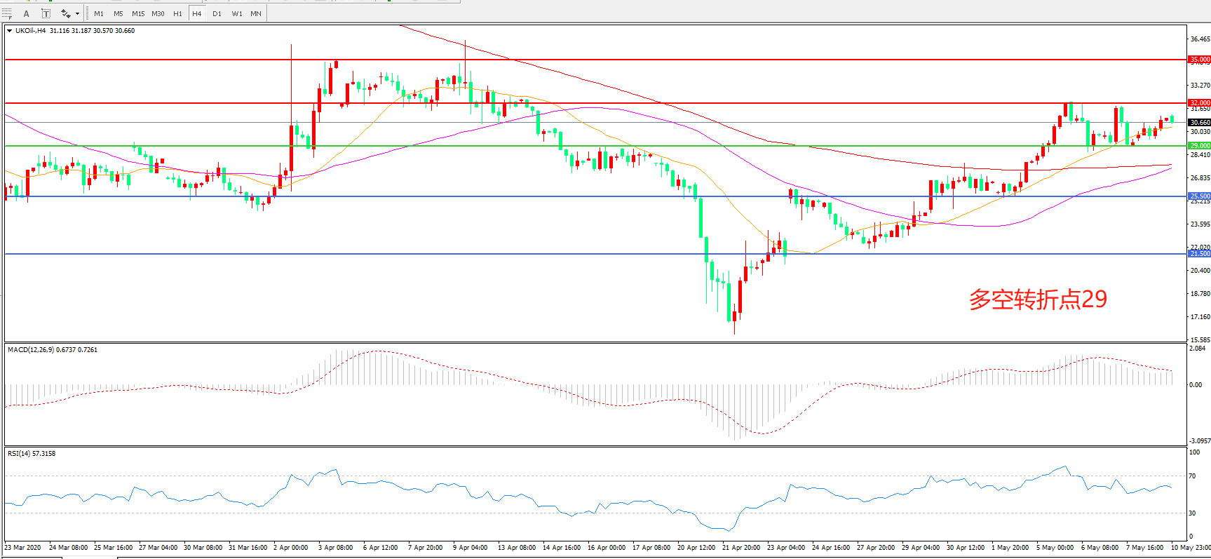 4小时图看,油价延续宽幅震荡,32美元成为短期阻力,21周期均线成为下方支撑,MACD红柱增加,RSI指标走平,日内延续上行概率较大。