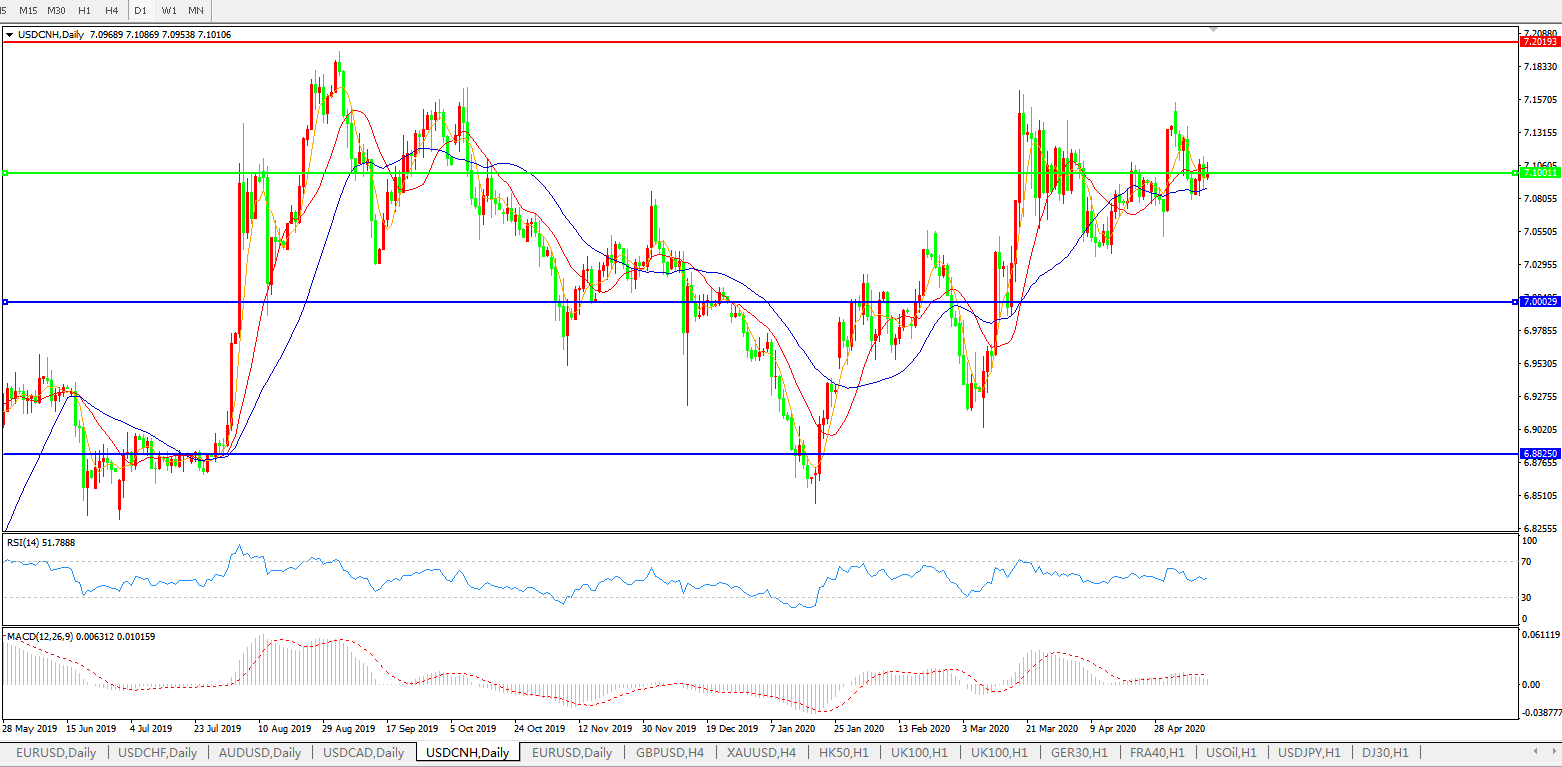 在岸人民币兑美元周二收盘微跌,中间价则跌150点。交易员称,经济过急重启可能引发疫情二次爆发的担忧,正明显提升市场避险情绪,此状况令美指重回100关口上方,人民币早盘一度触及7.1元关口后小幅回升,整体未偏离原先波动区间。美元短期可能仍偏强令人民币承压,但从经济基本面看人民币贬值空间并不大,升值空间亦有限; 交易员并指出,目前人民币不会有大的方向出来,当前市场情况下升值空间不大;贬值方向上,7.10和7.12元都有较强的阻力,除非受很大的事件驱动,一根线穿破所有的阻力位,否则,盘整行情仍将继续延续。 短期内,人民币汇率当前对于利空和利多的消息都不敏感,依旧维持区间震荡的格局, AxiCorp的首席全球市场策略师Stephen Innes表示,随着欧美逐渐重启经济,市场也开始关注疫情二次爆发的可能,市场避险情绪回升,美元再度获得买盘支撑;对于人民币而言,短期内消息面利空影响暂时有限,但离岸人民币受美元强势影响而下跌。