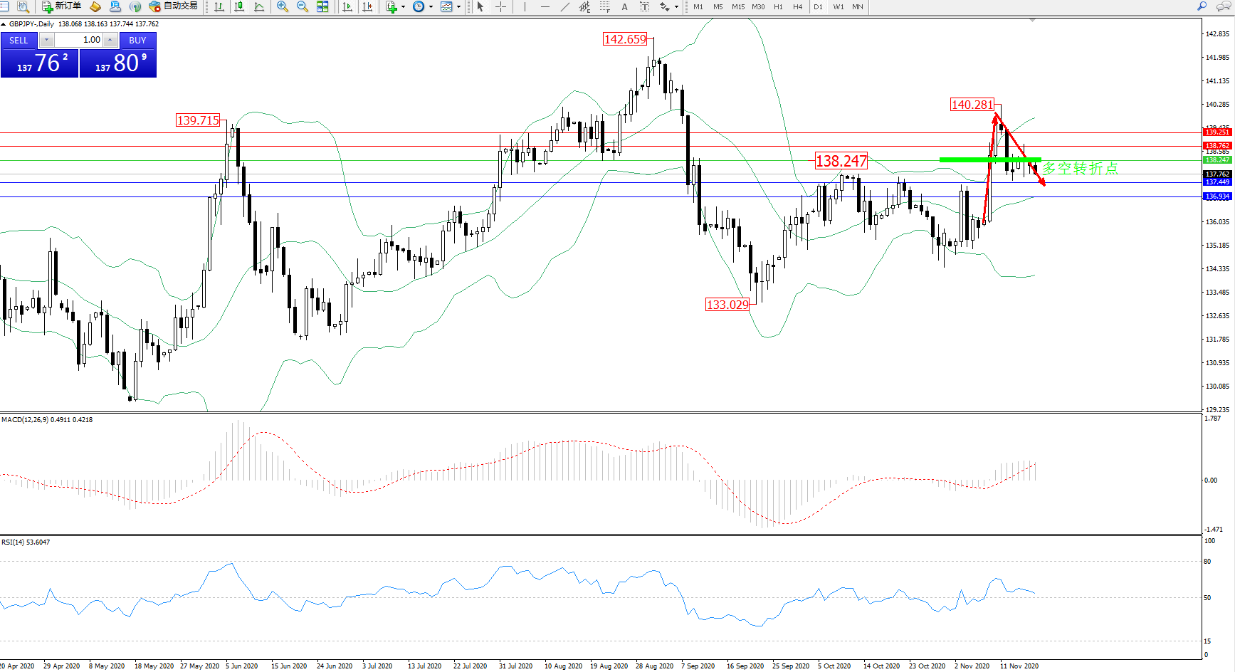 技术点评:多头动力延续布林带指标上轨附近强势拉升上扬后出现反转下移,高位抵达140.281附近后遇阻开始快速回撤,多头拉升动力结束,空头下行动力入场,布林带指标呈张口走势后有收口迹象,MACD指标低位多头多空持续震荡上扬至0轴线上方多头区域维持震荡,RSI指标处于50均衡线上方多头区域震荡后开始缓慢下行中;