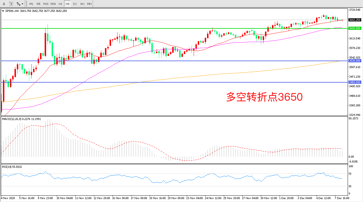 4小时图看,标普500延续高位震荡,上行趋势稳健,3650成为短期多空分水岭21周期均线成为短期支撑 MACD红柱增加,RSI指标向上,日内延续上行概率较大