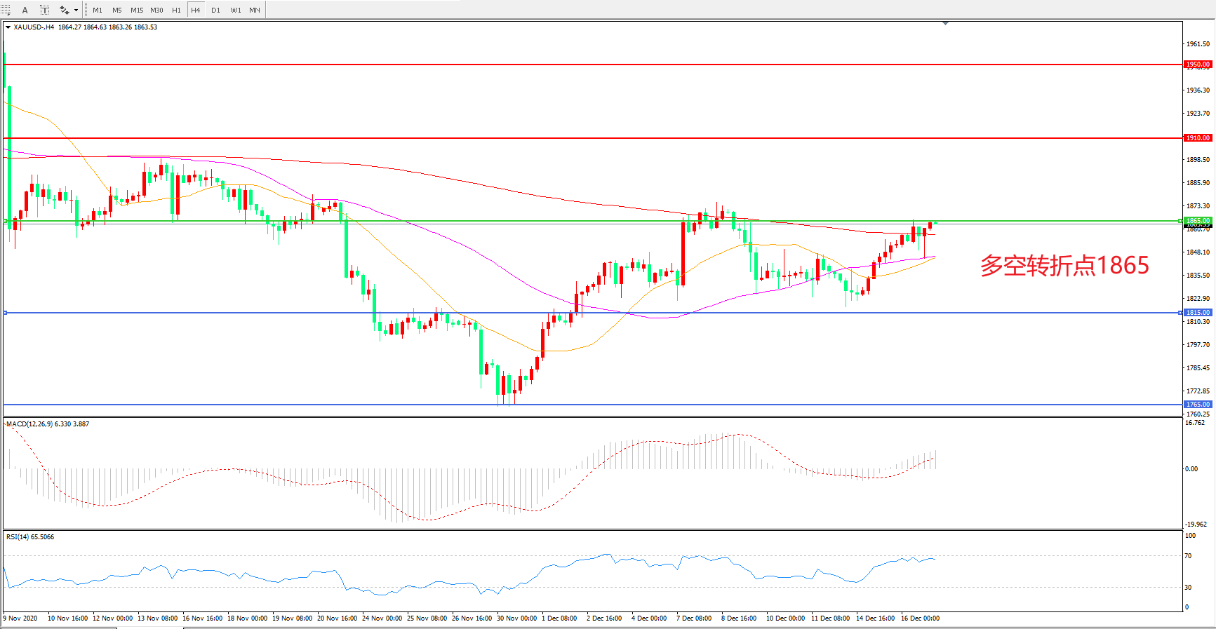 周三(12月16日),美国国会接近达成价值9000亿美元的财政刺激协议,美元指数创逾两年新低,现货黄金受到提振,盘中继续上行后收报1865美元/盎司。此前美国众议院议长佩洛西邀请民主共和两党领袖,讨论新一轮纾困计划,美国参议院多数党领袖麦康奈尔表示,大家已经就“不达成协议就不离开华盛顿”达成了一致。据报道称,方案或于本周内落实。