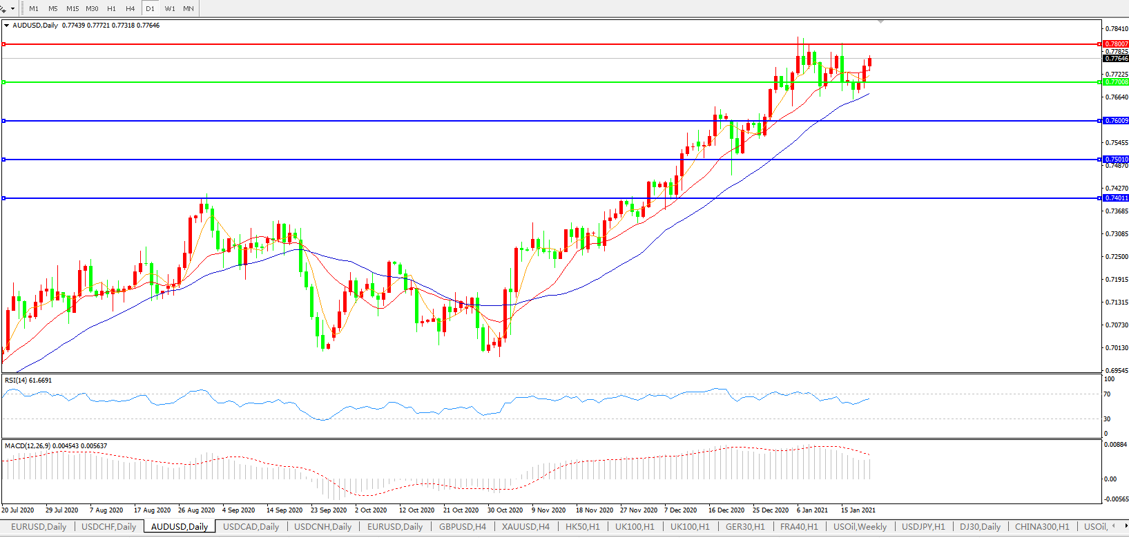 交易策略:0.7700上方看涨,目标0.7800、0.7900