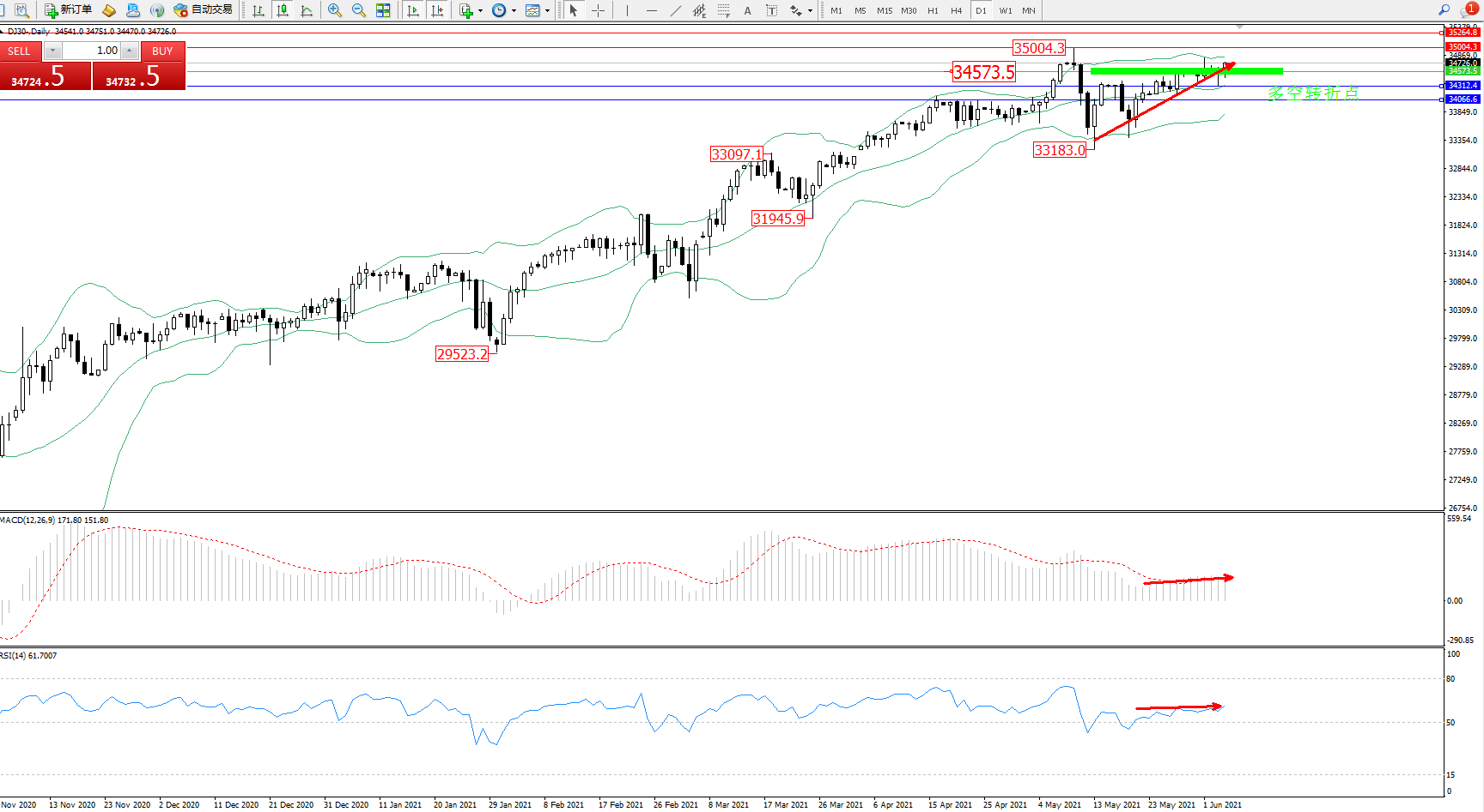 交易策略:34573上方看涨,目标35004、35264