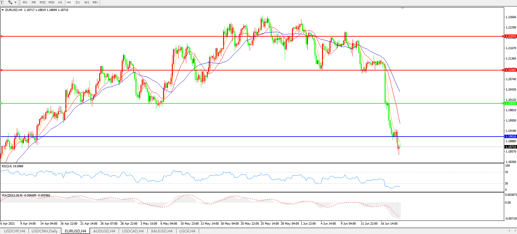 技术面简析:4小时图均线发散下行,汇价持续快速大跌下行,MACD下穿0轴且量能快速放量,RSI快速走弱,预计短期汇价大概率将进一步下行。
