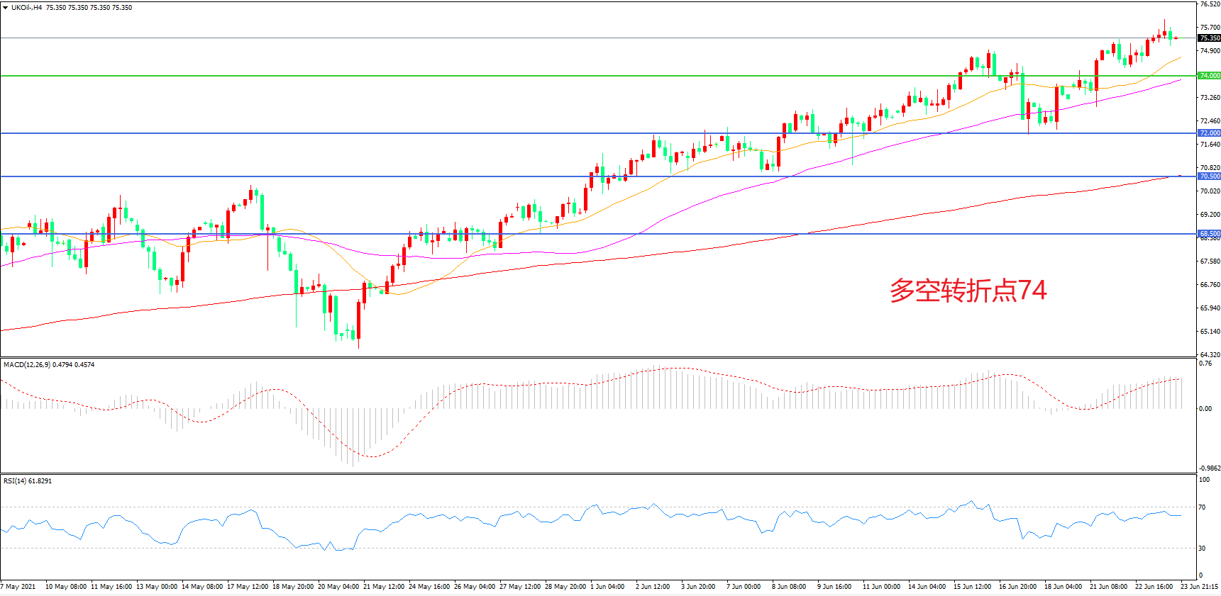 4小时图看,油价突破74美元阻力后再度上行,短期表现强势,均线系统成为下方支撑,MACD红柱增加,RSI指标走平,日内震荡上行概率较大