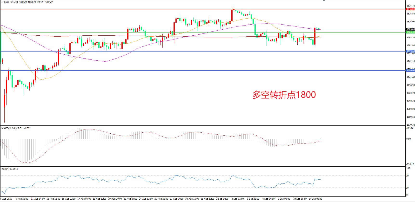 4小时图看,金价长阳拉升,强势突破上方阻力,55周期均线成为下方支撑,1800成为多空分水岭,MACD绿柱缩短,RSI指标走平,日内震荡上行概率较大。