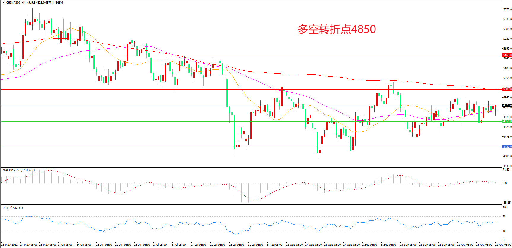 4小时图看,沪深300以均线系统为依托震荡反弹,5000点成为上方阻力,4850成为下方支撑,MACD红柱缩短,RSI指标走平,日内延续震荡概率较大。