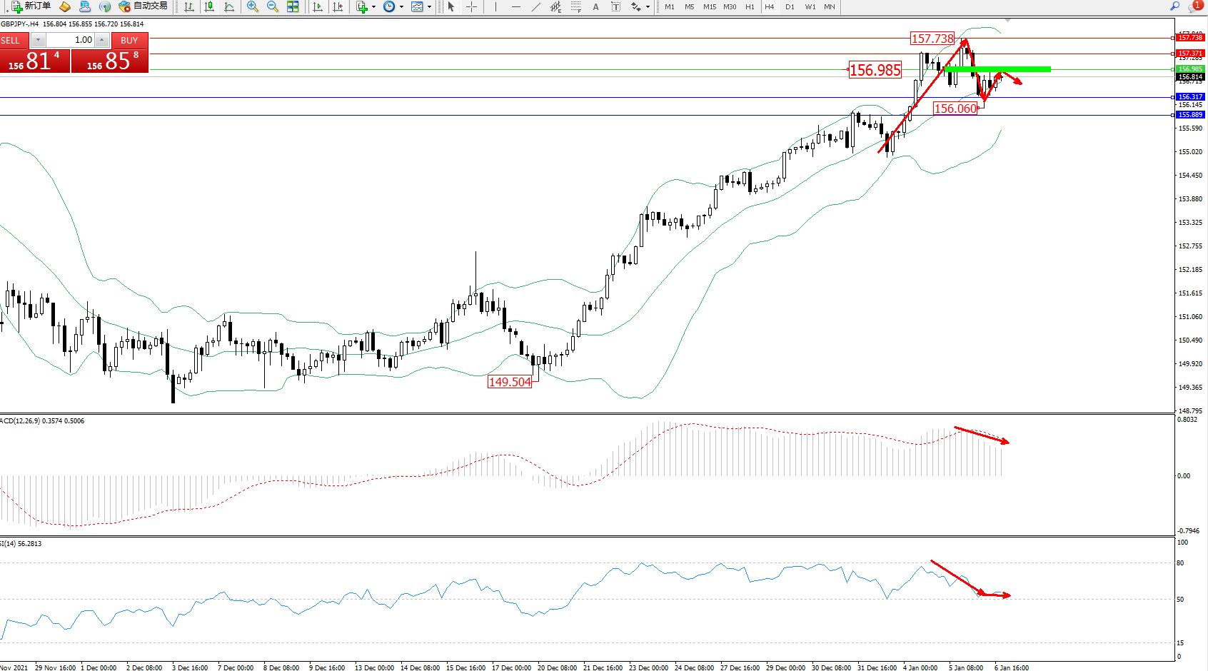 交易策略:156.985下方看跌,目标156.317、155.889
