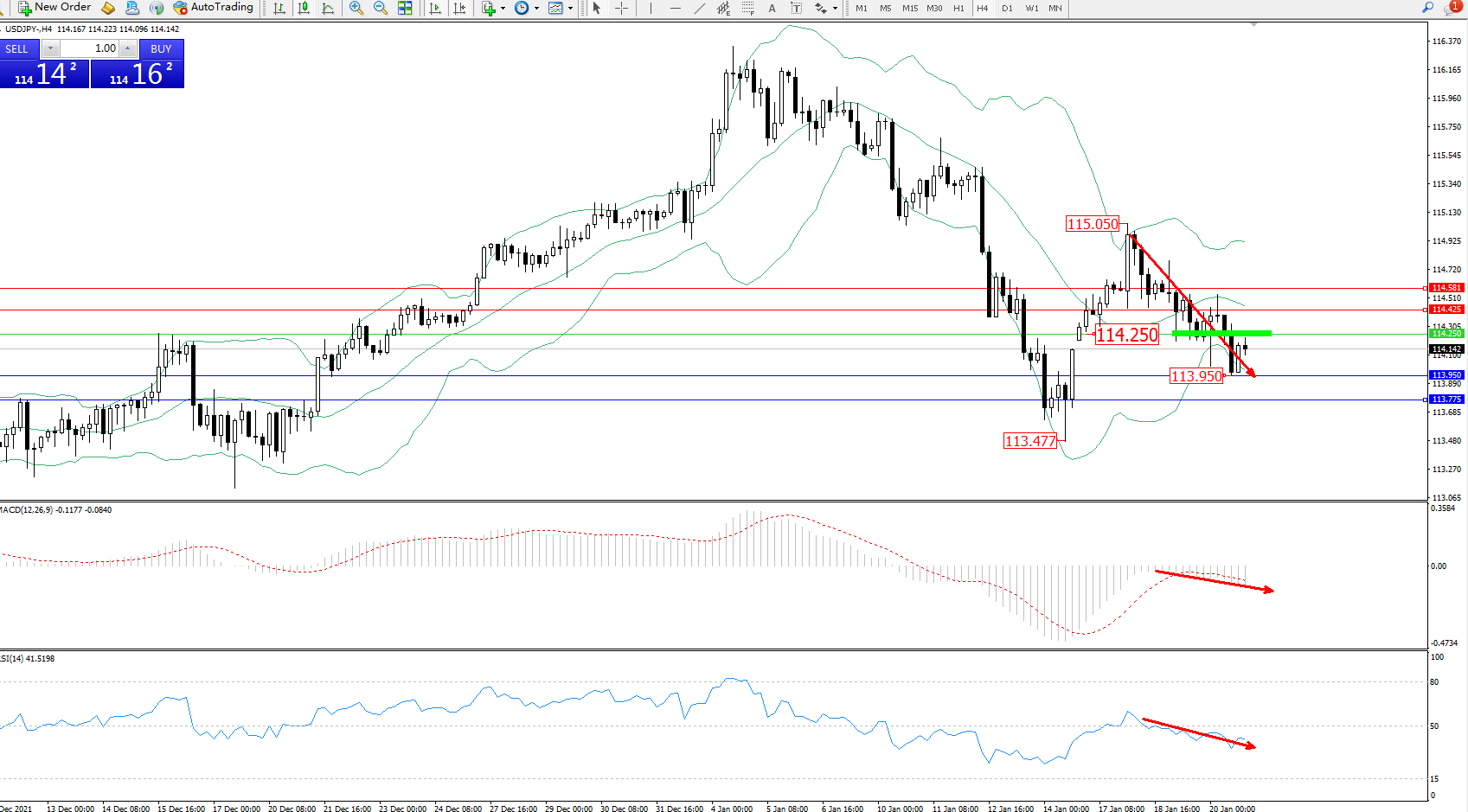 交易策略:114.250下方看跌,目标113.950、113.775