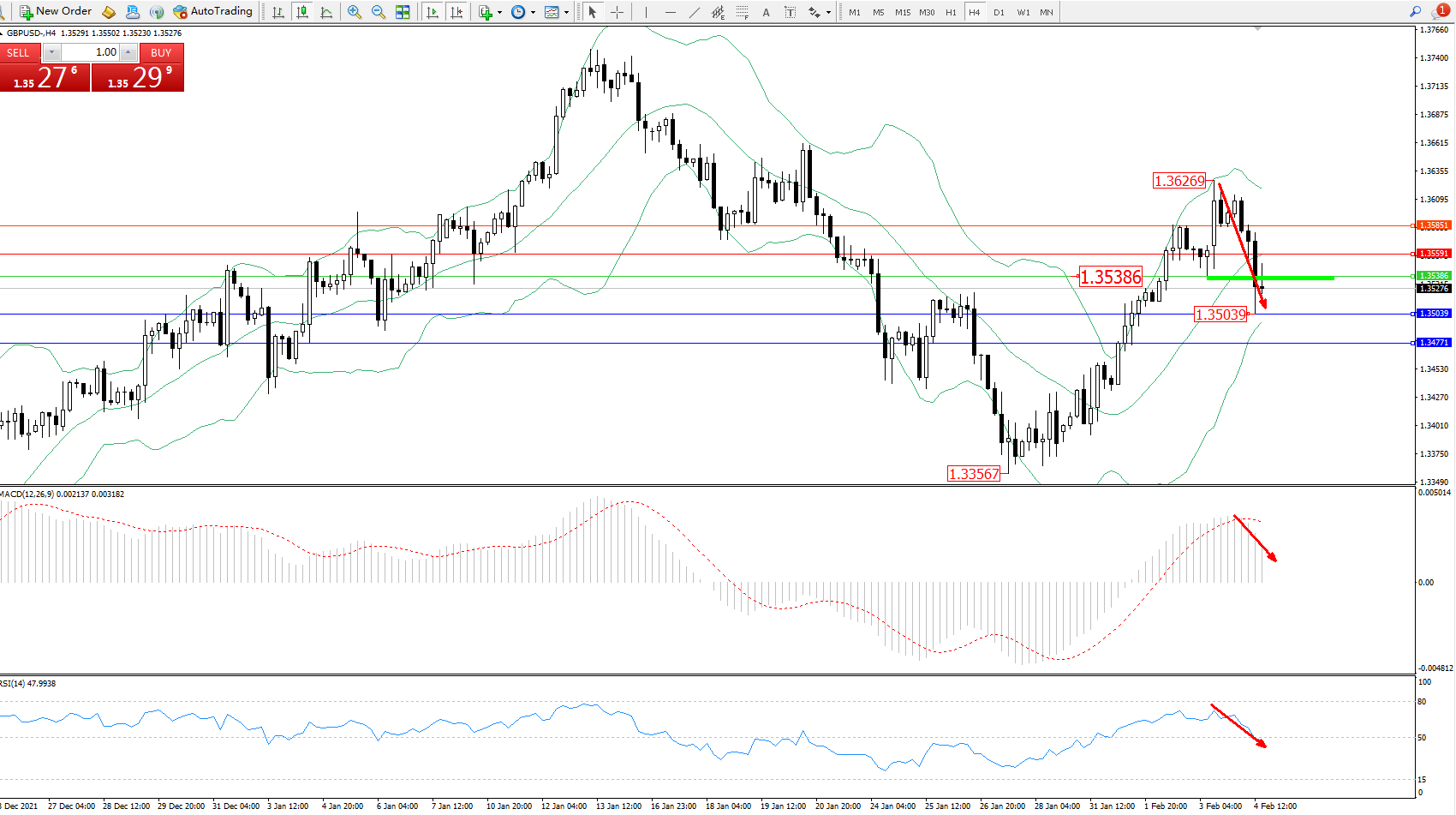 交易策略:1.35386下方看跌,目标1.35039、1.34771