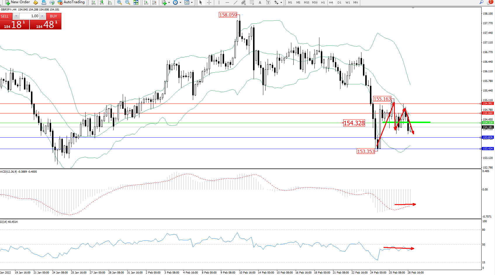 交易策略:154.328下方看跌,目标153.826、153.434