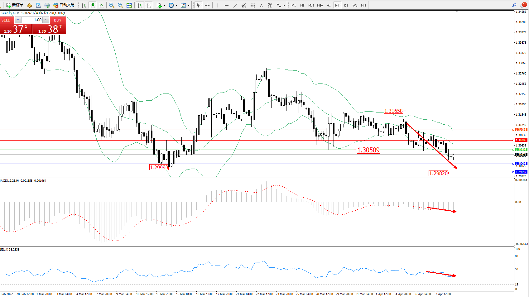 技术点评:空头动力延续布林带指标通道中下轨区间持续震荡下挫,低位抵达1.29820位置节点后回升,短期空头下行趋势态势良好,布林带指标呈空头不断向下移动中,MACD指标处于0轴线下方弱势徘徊下行中,RSI指标处于50均衡线下侧弱势整理;