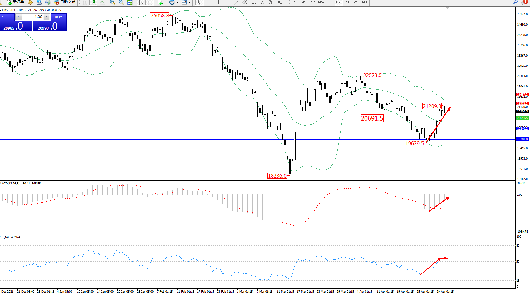 香港恒生指数5月3日(周二)收盘上涨12.5点,涨幅0.06%,报21101.89点;港股五月首个交易日指数涨跌不一,恒生科技指数跌1.38%,盘中一度跌4.3%。盘面上,大学科技股普遍走低,京东跌近6%,小米跌4.4%,阿里巴巴收跌1.76%,盘中一度跌9%,腾讯小幅收涨0.69%;中银香港涨4.36%领涨,汇丰控股涨近3%,渣打集团涨逾2%。美联储在美国时间的2022年5月3日至5月4日召开为期两日的利率决议,在北京时间的5月5日凌晨02:00公布利率决议结果。此前,美联储主席鲍威尔暗示美国5月加息50个基点。这也将是美联储自2000年以来首次会议上单次加息50个基点。此外,投资者还认为美联储连续三次加息50个基点(或更多)的概率约为83%——这是自1994年以来从未有过的。作为衡量美国加息预期的重要指标,十年期美债本周一曾突破3%,这也是2018年11月后的首次。由于香港实行与美元挂钩的联系汇率制度,美债收益率攀升利好香港本地银行股。
