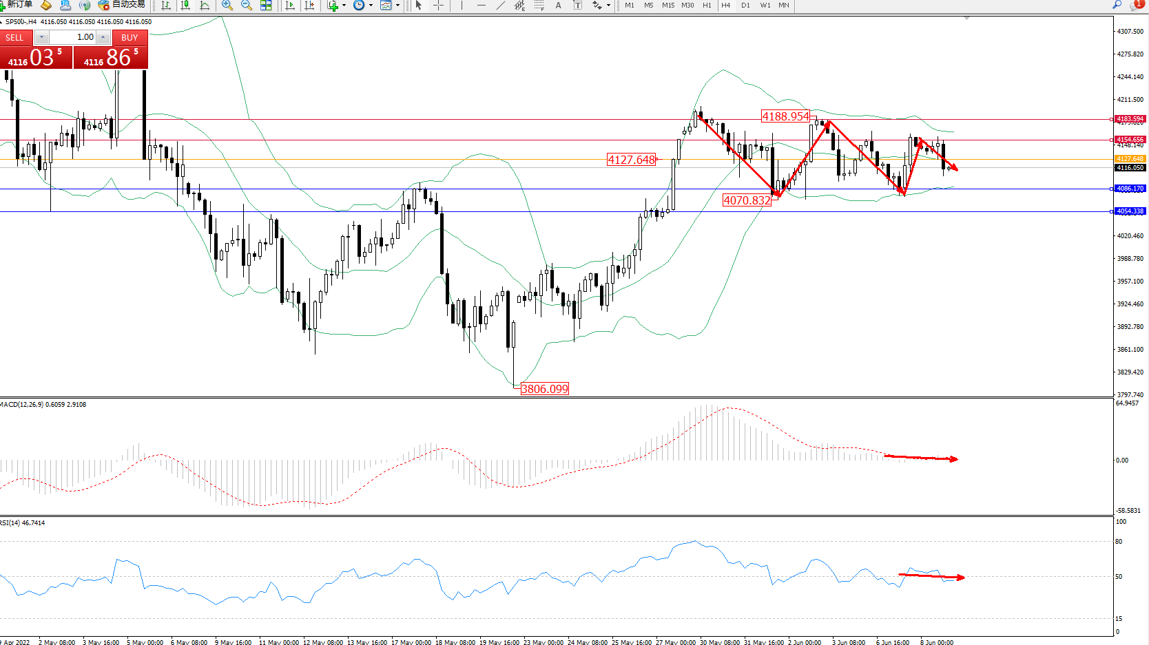 标普SP500——4小时K线图显示: