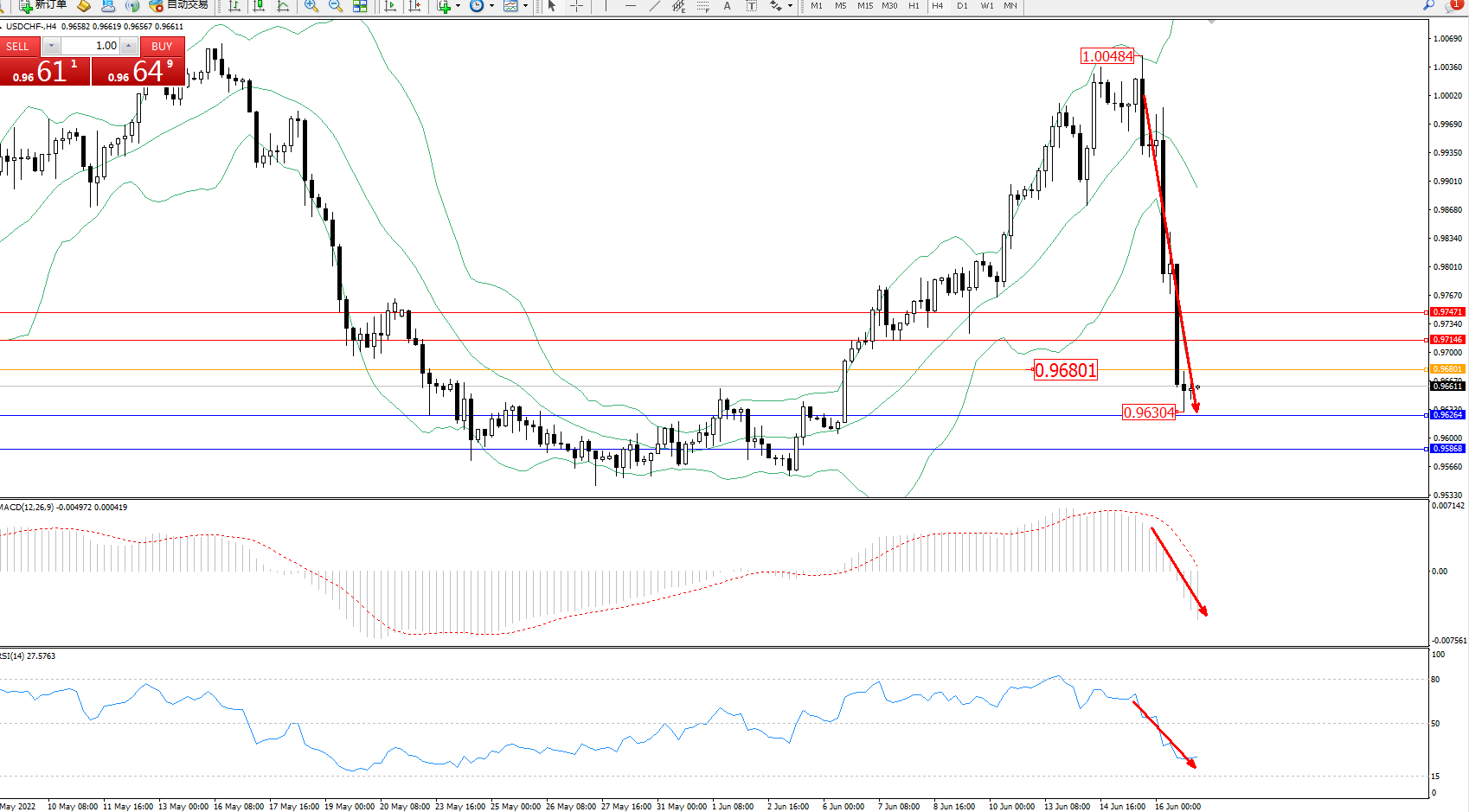交易策略:在0.96801下方看跌,目标0.96264、0.95868