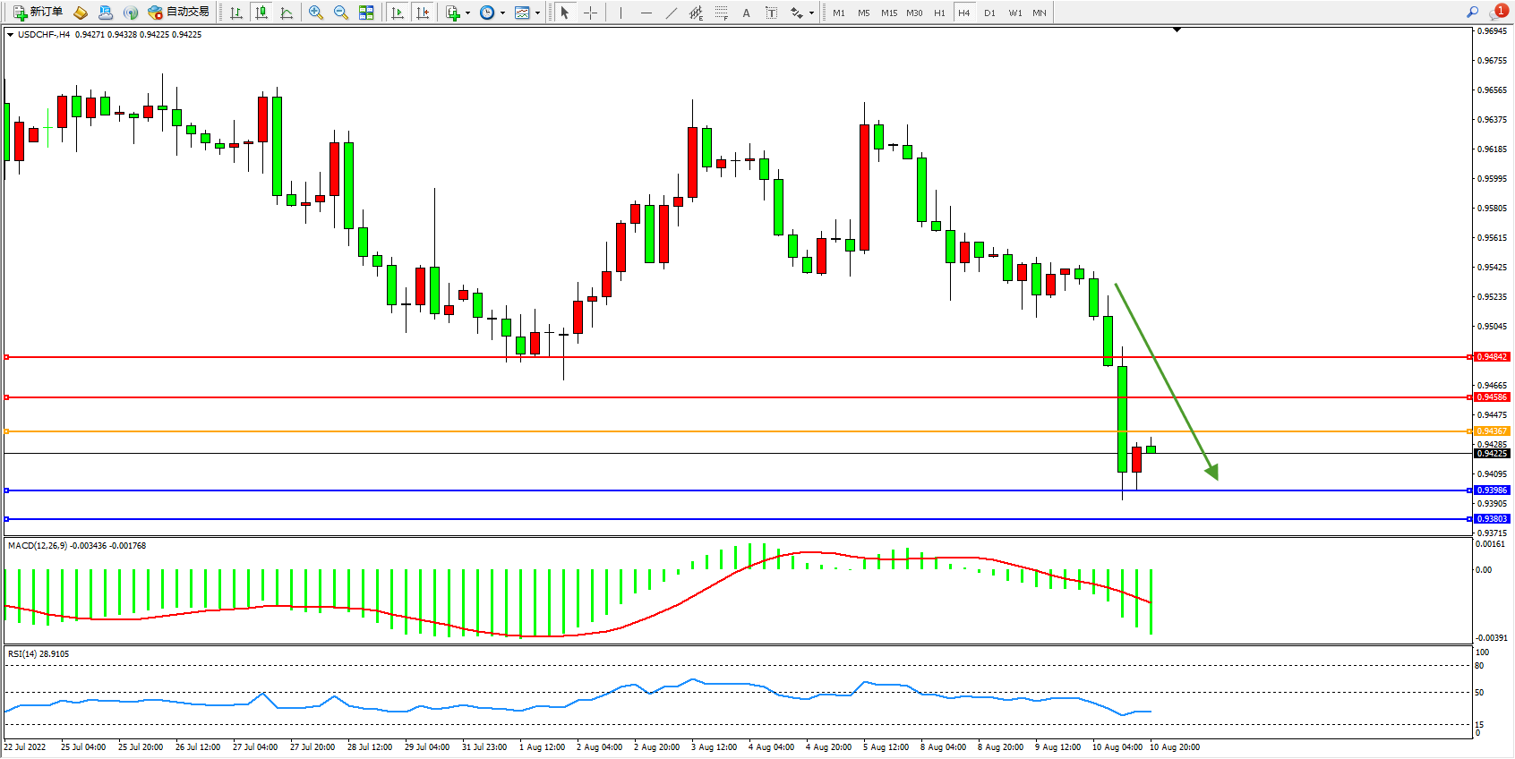 美元瑞郎USDCHF——4小时K线图显示:
