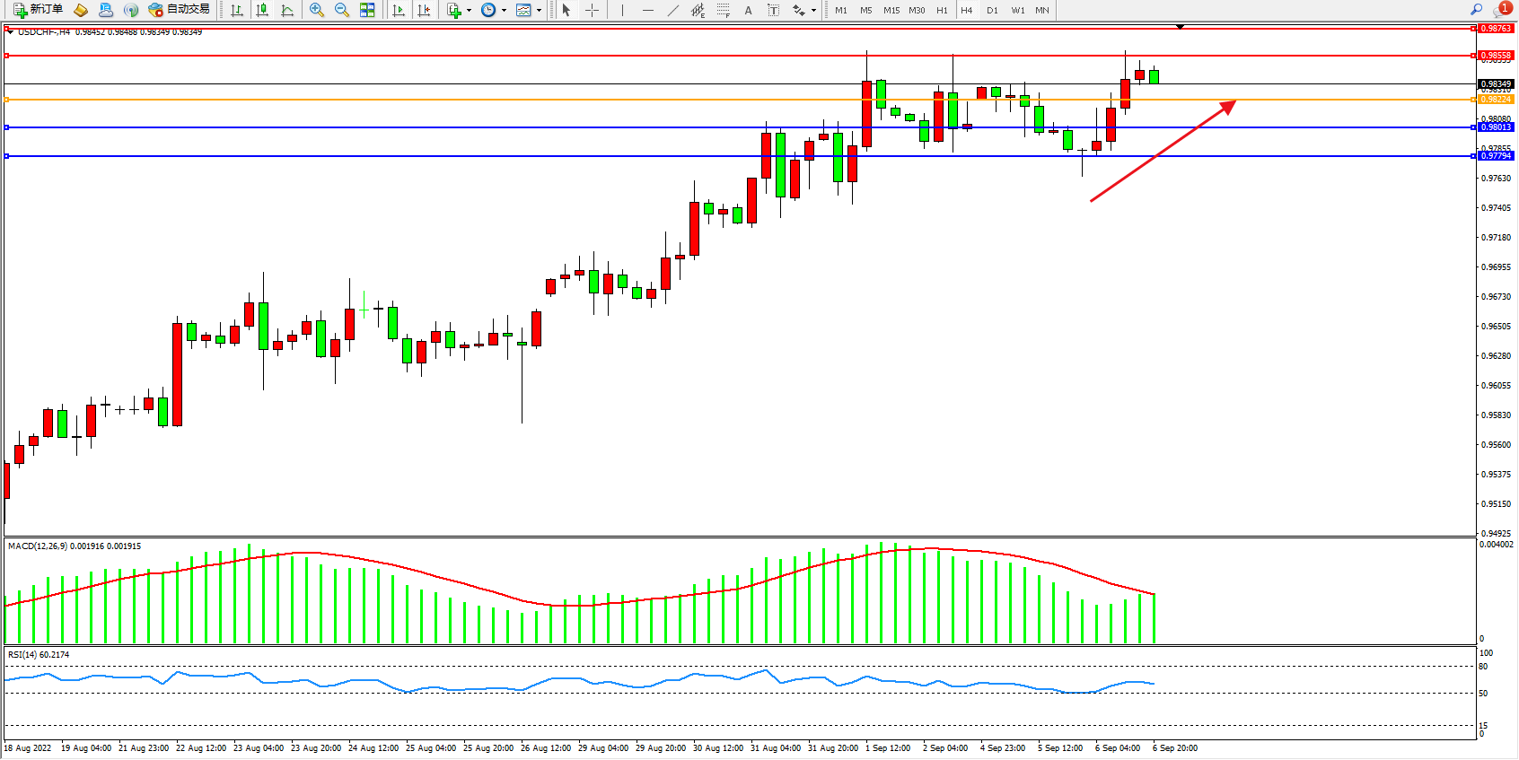 美元瑞郎USDCHF——4小时K线图显示: