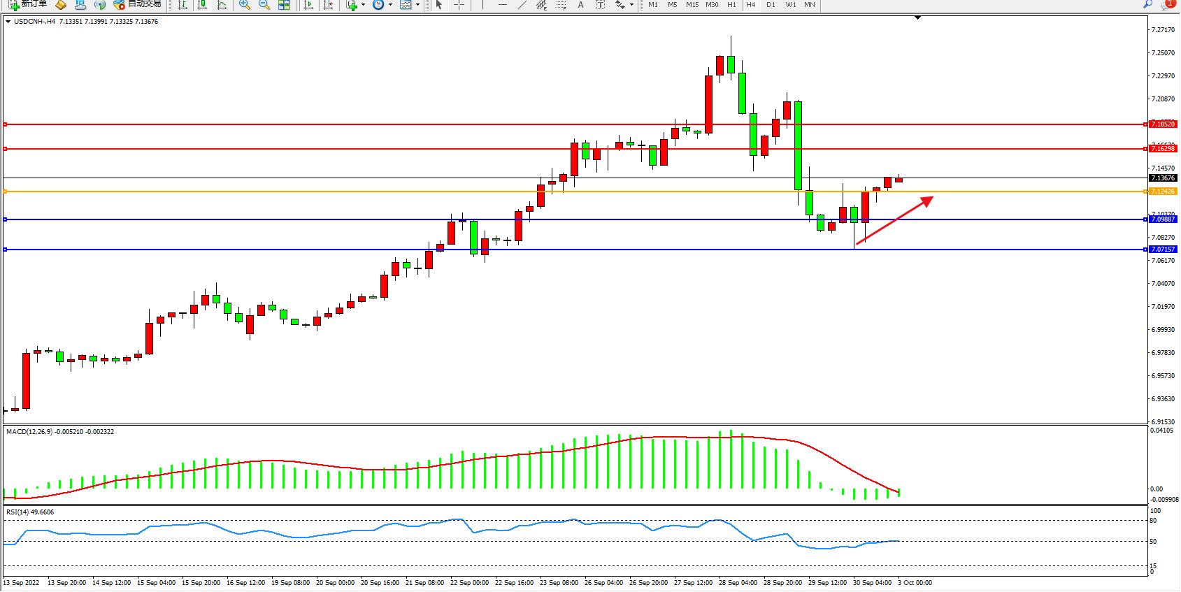 交易策略:7.12426上方看涨,目标7.16298、7.18520