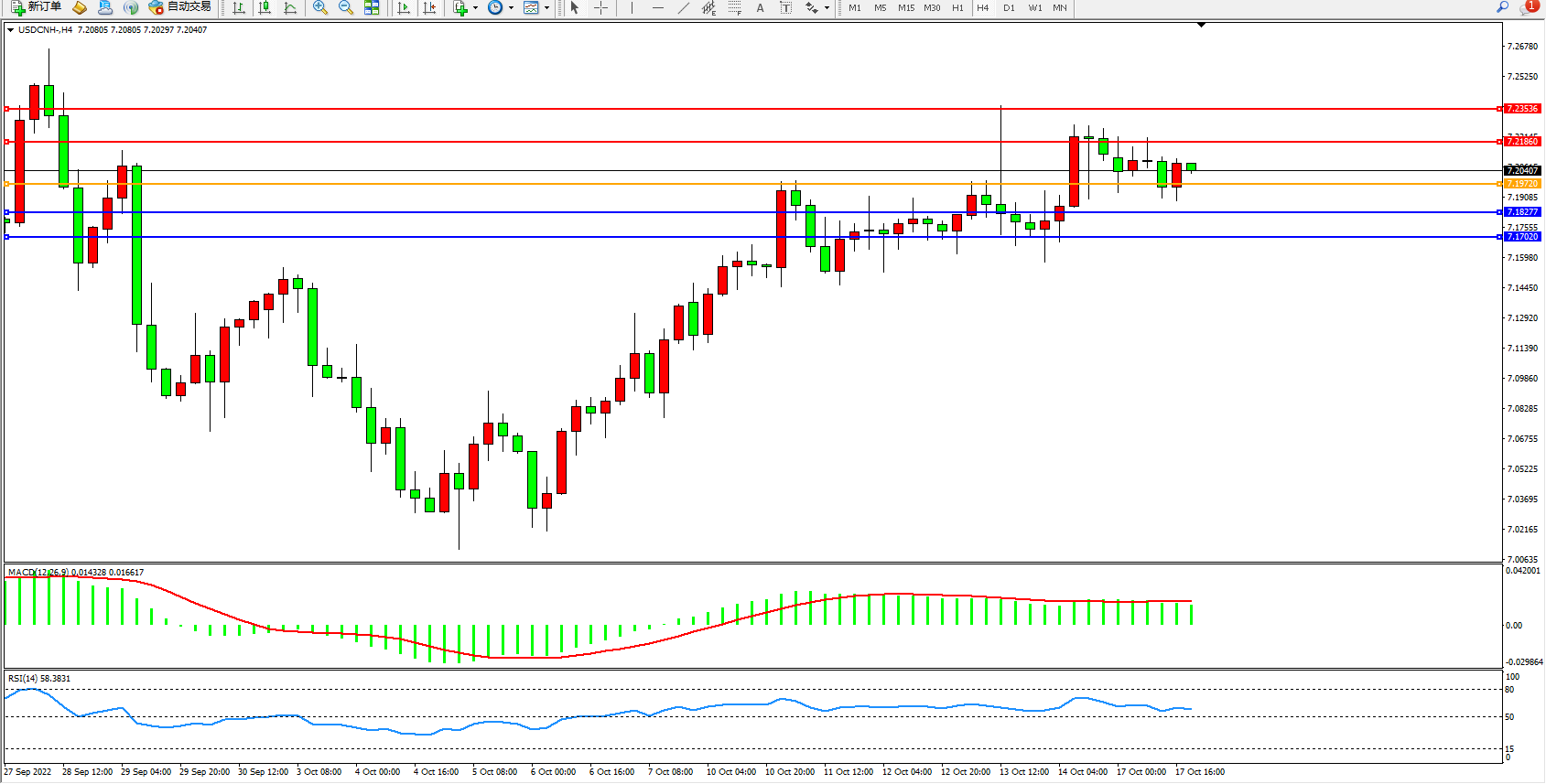 美元人民币USDCNH——4小时K线图显示: