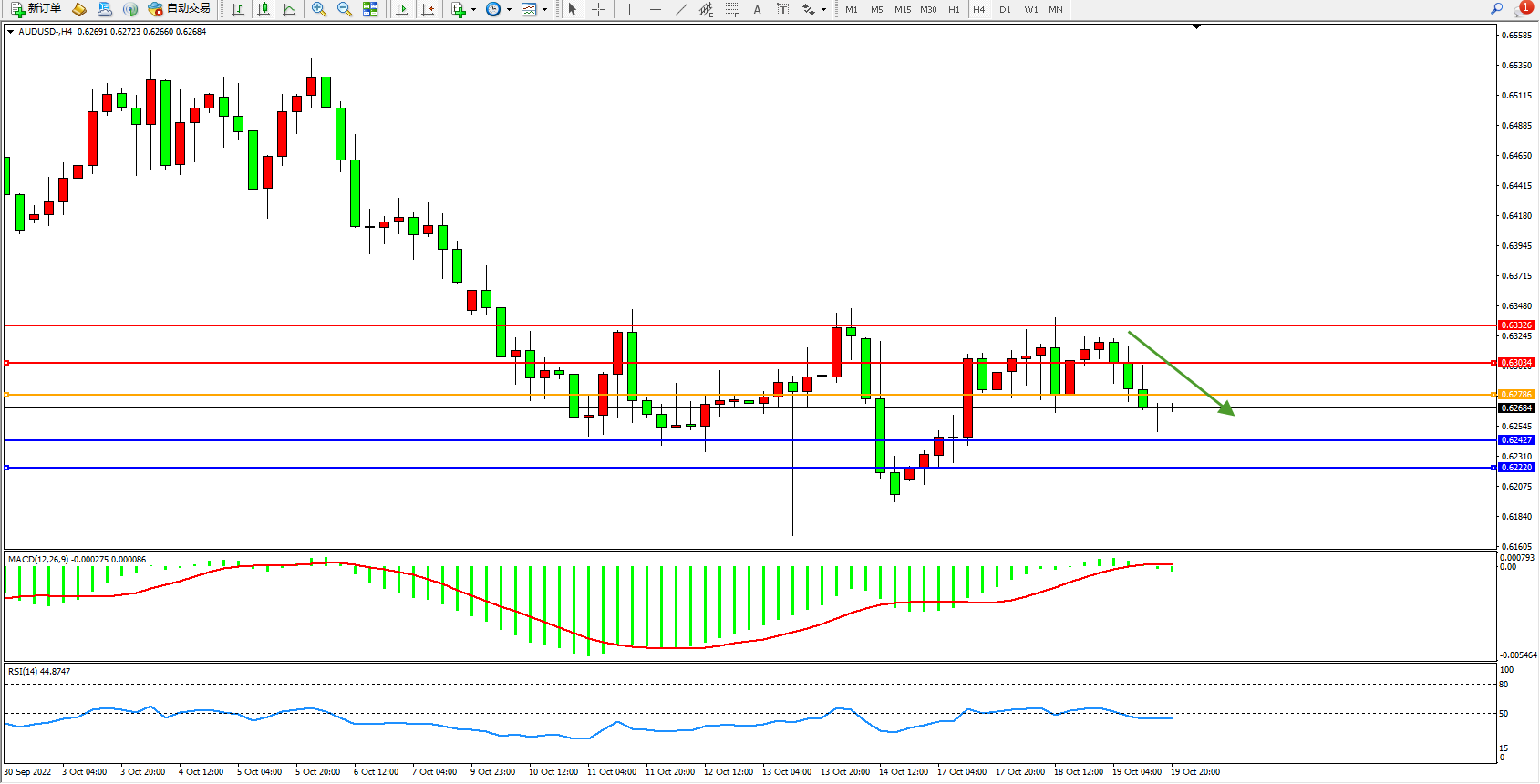 交易策略:0.62786下方看跌,目标0.62427、0.62220