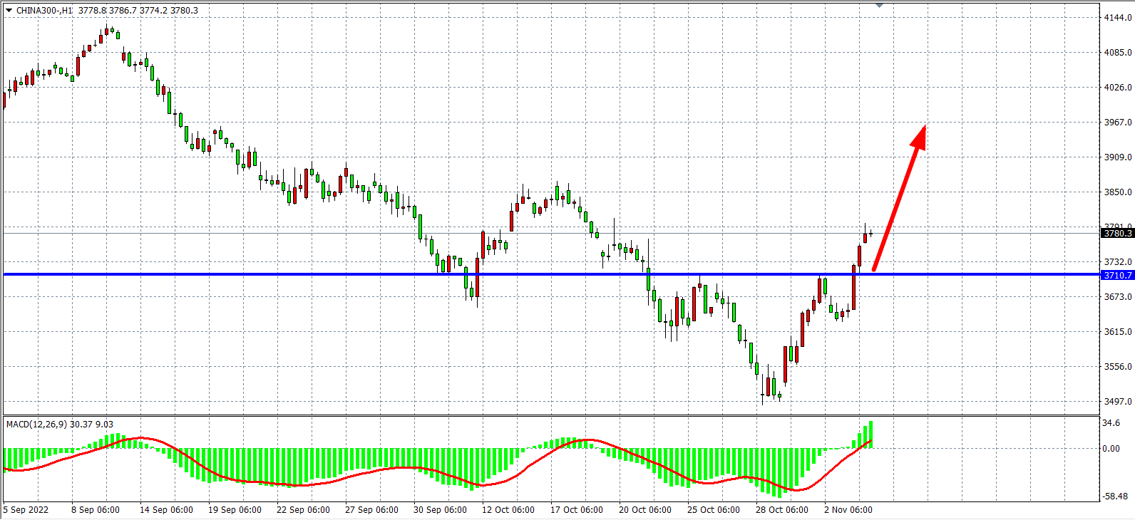 1小时图看,沪深300在3710之上持续走强,同时MACD量能在零轴之上持续放大,显示行情有进一步上升空间。日内在3710之上继续看涨为主,上方目标3850-3900