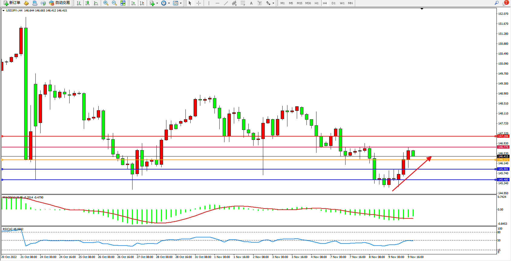交易策略:146.272上方看涨,目标146.775、147.206