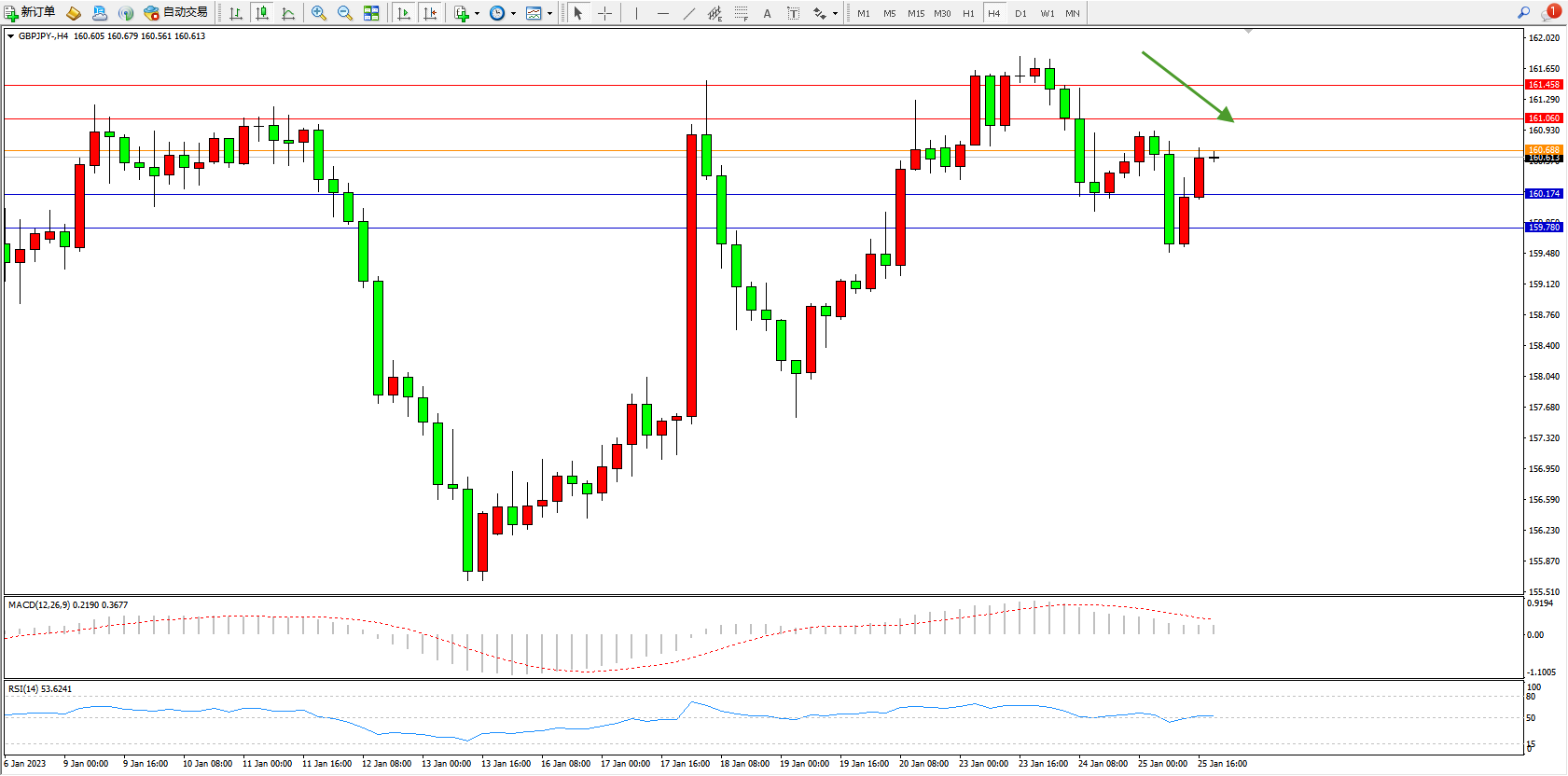 备选策略:160.688上方看涨,目标161.060、161.458