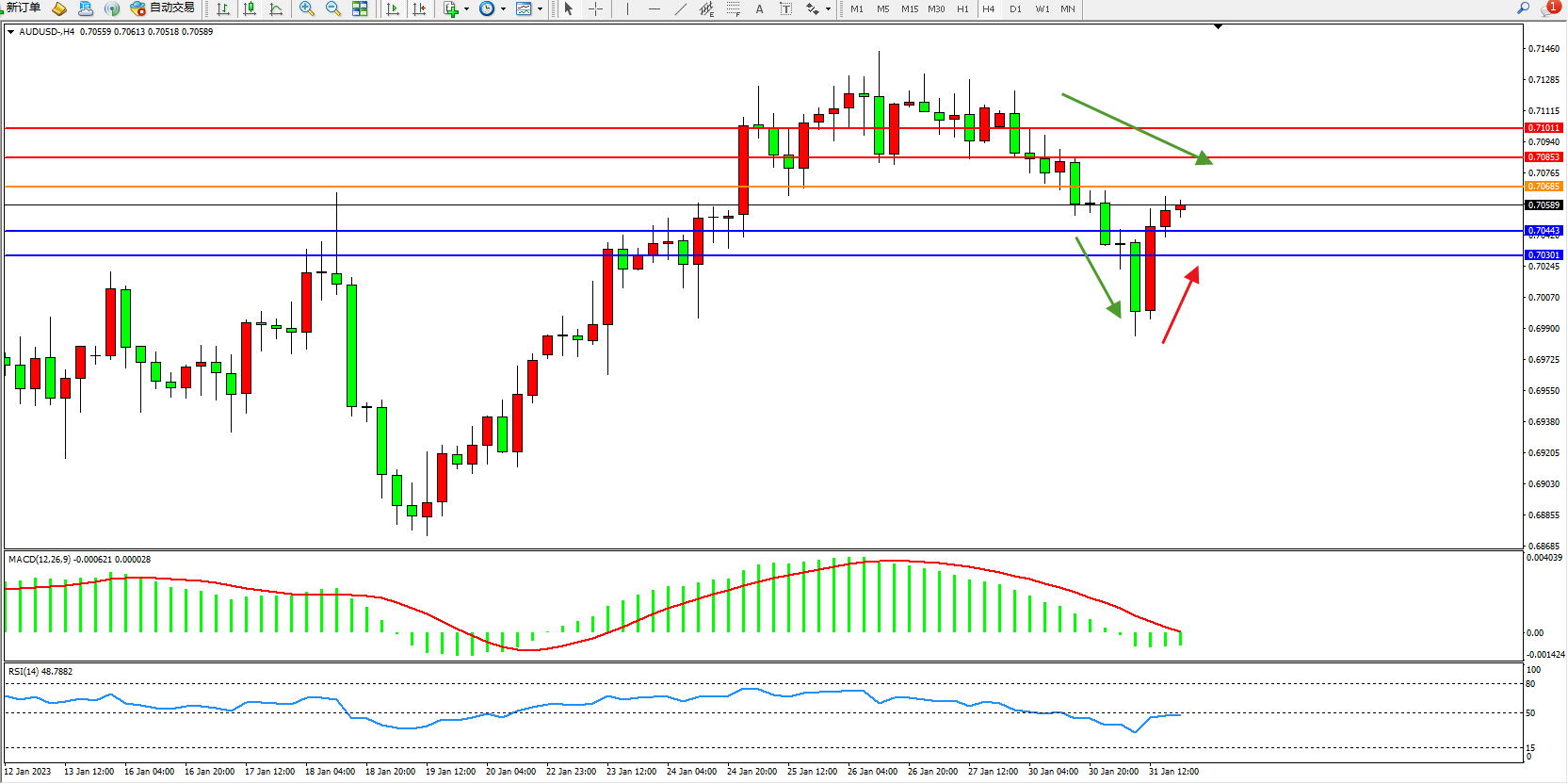 交易策略:0.70685下方看跌,目标0.70443、0.70301