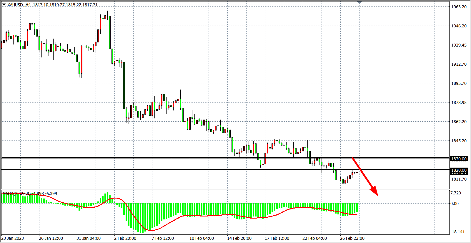 周一(2月27日)美国1月耐用品订单月率录得-4.5%,预期为-4%,前值为5.1%,为2020年4月以来最大降幅,美元指数盘中跳水结束日线四连涨,现货黄金走高一度上触1820关口,最终收涨0.3%。展望后市,随着联邦基金利率峰值的持续重新定价,以及美国国债收益率上升令金价承压,整体环境对黄金颇具挑战性。