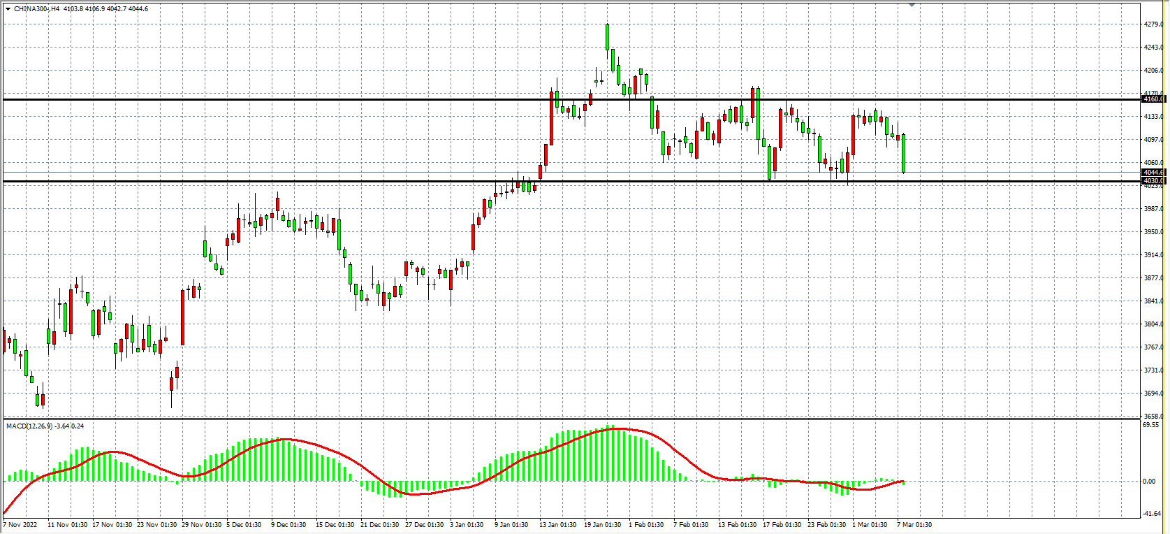 4小时图看,沪深300在4100之下继续回落走低,同时MACD于零轴附近持续缩量,行情继续整理,当前走势维持4030-4160箱体整理,若下破40300后市有望打开下行空间,否则维持区间整理看待。