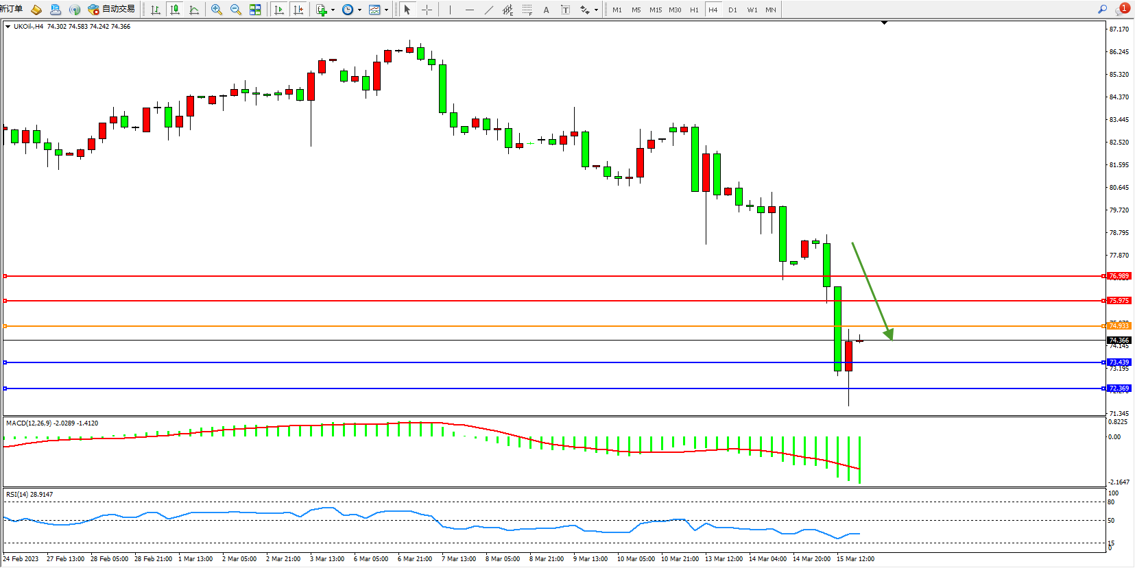 交易策略:74.933下方看跌,目标73.439  72.369